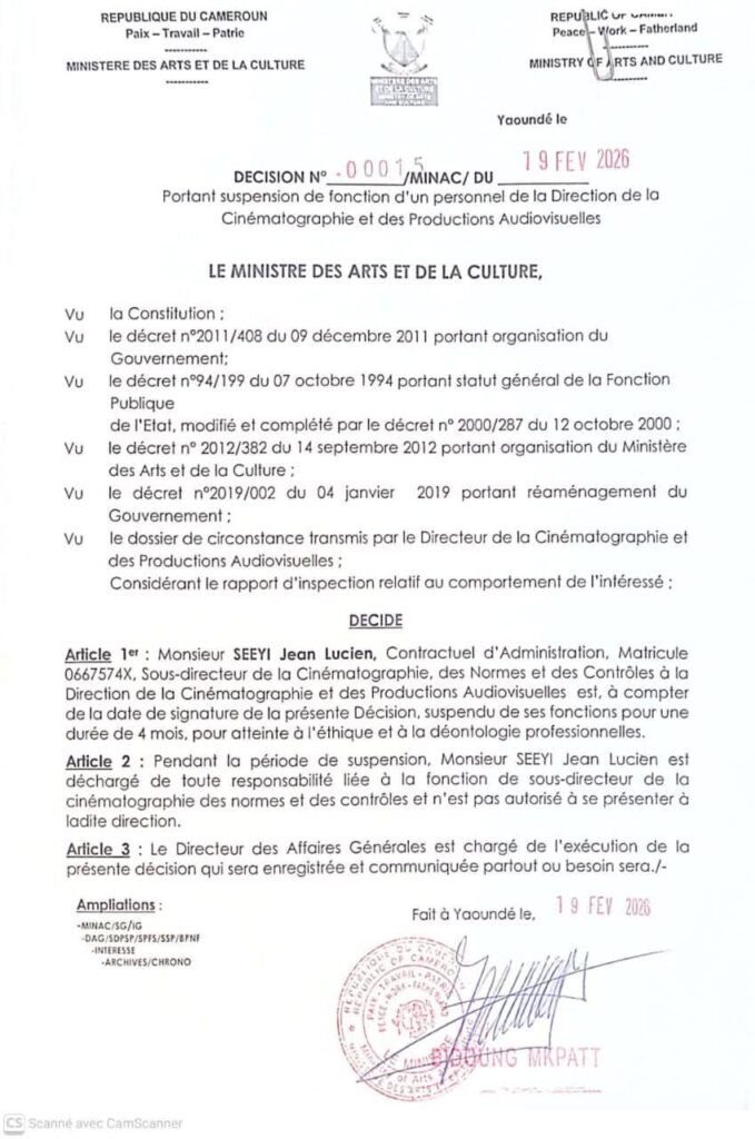 Le ministère des Arts et de la culture a engagé une action disciplinaire majeure au sein de la Direction de la Cinématographie et des productions audiovisuelles. Par une décision signée le 19 février 2026 à Yaoundé, le Ministre Pierre Ismaël Bidoung Kpwatt a ordonné la suspension de Seeyi Jean Lucien, sous-Directeur de la cinématographie des normes et des contrôles. Le texte officiel est sans équivoque. Il précise que l’intéressé est suspendu « pour atteinte à l’éthique et à la déontologie professionnelles », à la suite d’un dossier de circonstance transmis par la hiérarchie et d’un rapport d’inspection relatif à son comportement.